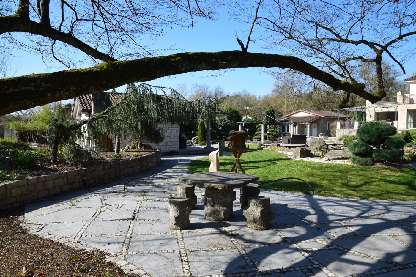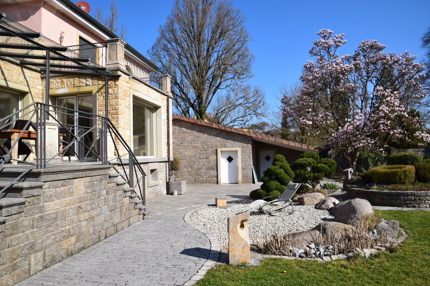 - hochwertig verlegter Naturstein im Haus, im Garten und in den Nebengebäuden