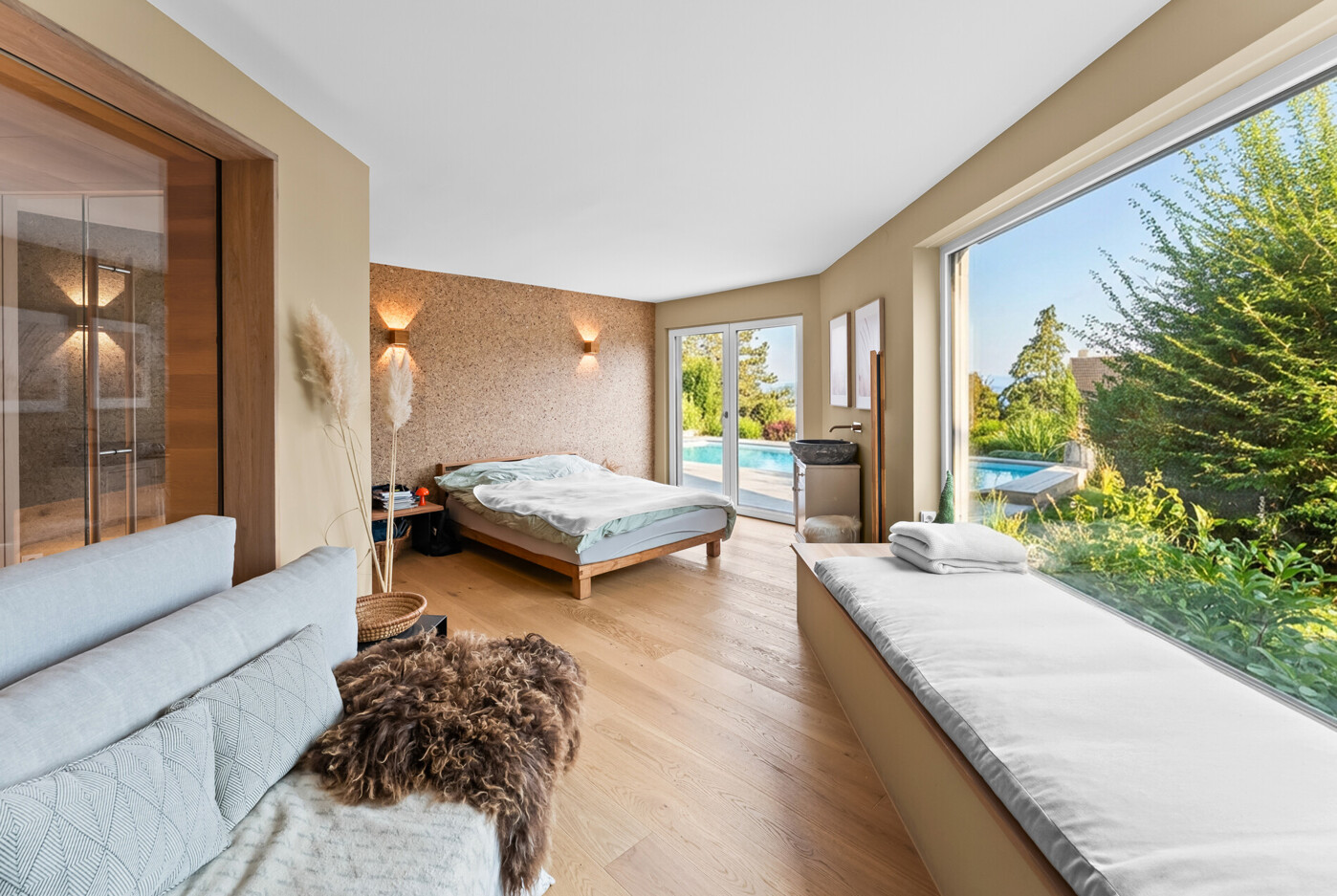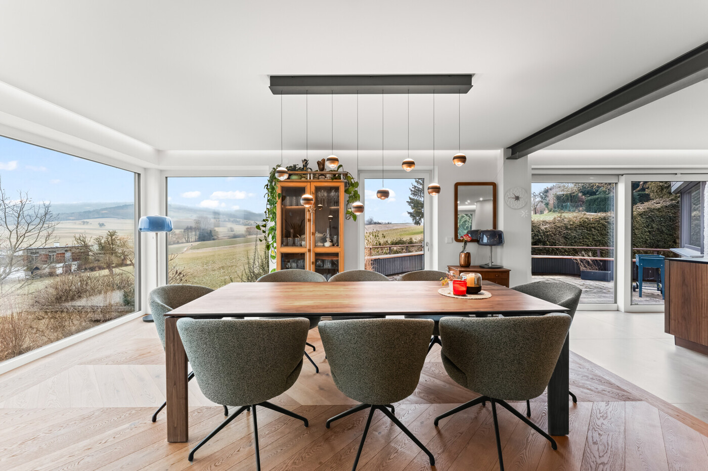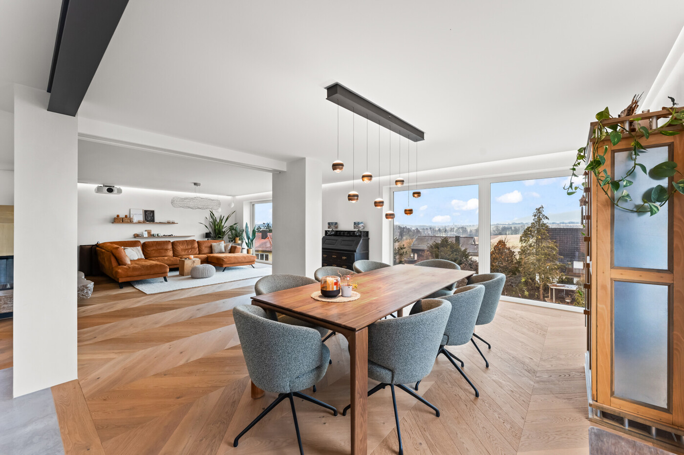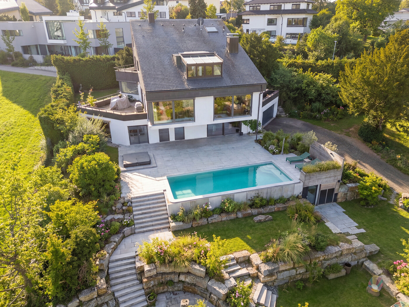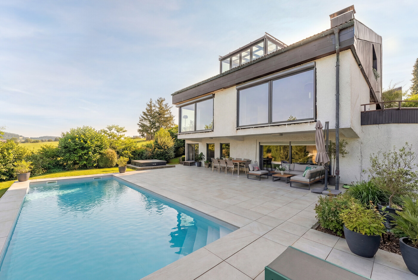 Der unverbaubare und weite Blick in die Fränkische Schweiz, verbunden mit der Ruhe und Stille sind der Grundstein für eine ausgewogene Work-Life Balance. Sie wohnen in einem im Jahr 2023/24 vollständig und kompromisslos sanierten Architekten-Haus mit einem Höchstmaß an Luxus und hochwertiger Ausstattung. Die Immobilie überzeugt durch außergewöhnliche Architektur, klare Linienführung, innovative Materialien und großzügige Grundrisse. Die Kombination aus moderner Baukunst und durchdachter Raumgestaltung schafft ein Wohnumfeld, das ästhetisch und komfortabel zugleich ist. Höchste Ansprüche werden zum Beispiel durch den exklusiven Heizkamin, oder beheiztem mit Turbinen-Gegenstromanlage ausgestatteten Swimmingpool erfüllt, ebenso durch die verwendeten Materialien. Exquisites Design und Funktionalität findet sich im ganzen Objekt. Im Gegensatz zu meist doch enger bebauten Grundstücken liegt diese Immobilie auf einem stattlichen Anwesen mit ca.2.000 m² in Erbbaurecht mit einem Jahreszins in Höhe von 2.0313,16 €. Ein zweites unbebautes Grundstück mit 810 m² wäre zusätzlich zu erwerben.Lage
